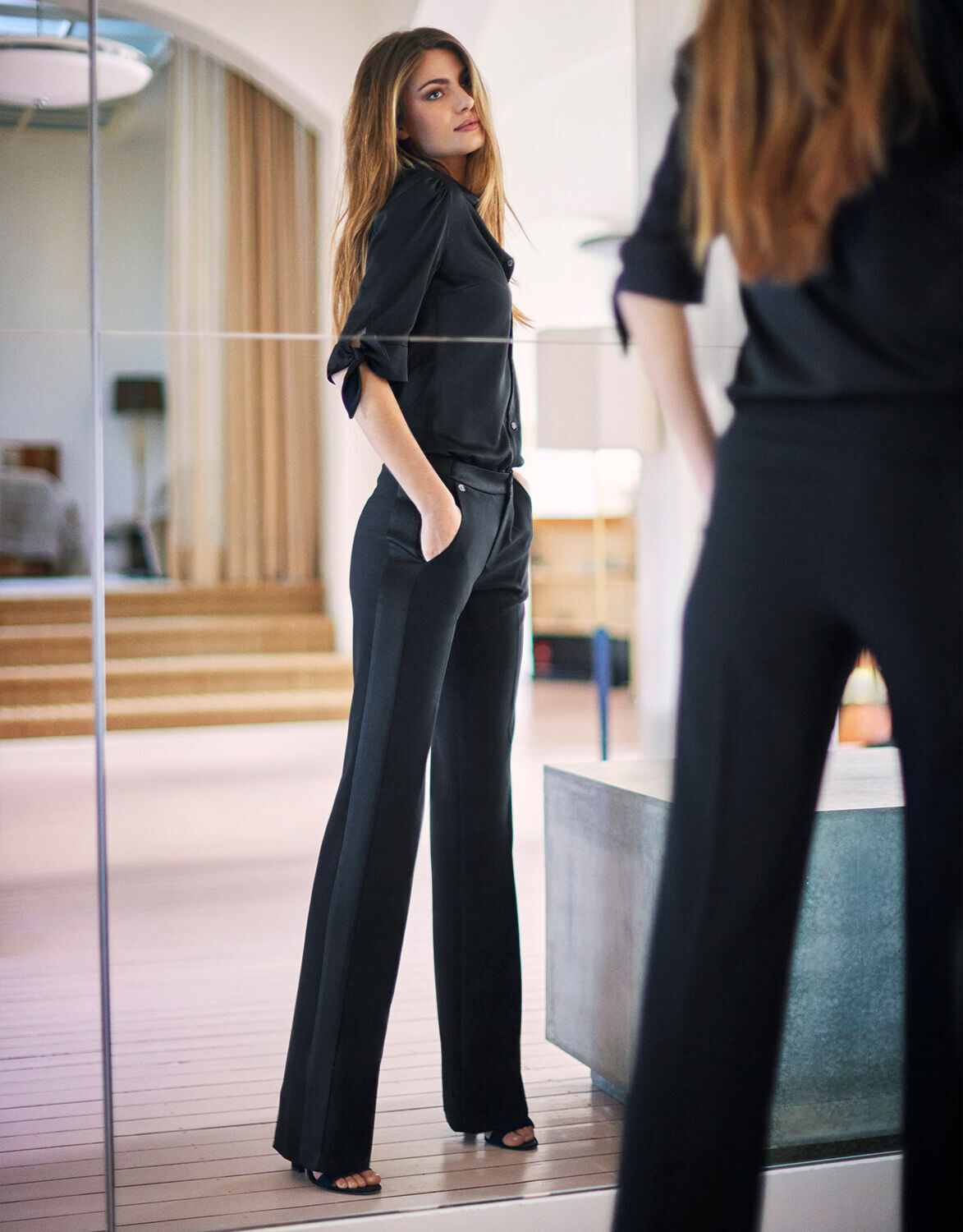 These straight-leg pants will effortlessly take you from desk to dinner. Palma is made of a smooth crêpe satin, detailed with satin accents. We’ve added elastic in the waistband for extra comfort. Complete your look with one of our blouses and a blazer. Note: this delicate fabric requires careful handling, avoid contact with rough or sharp objects to prevent damage.